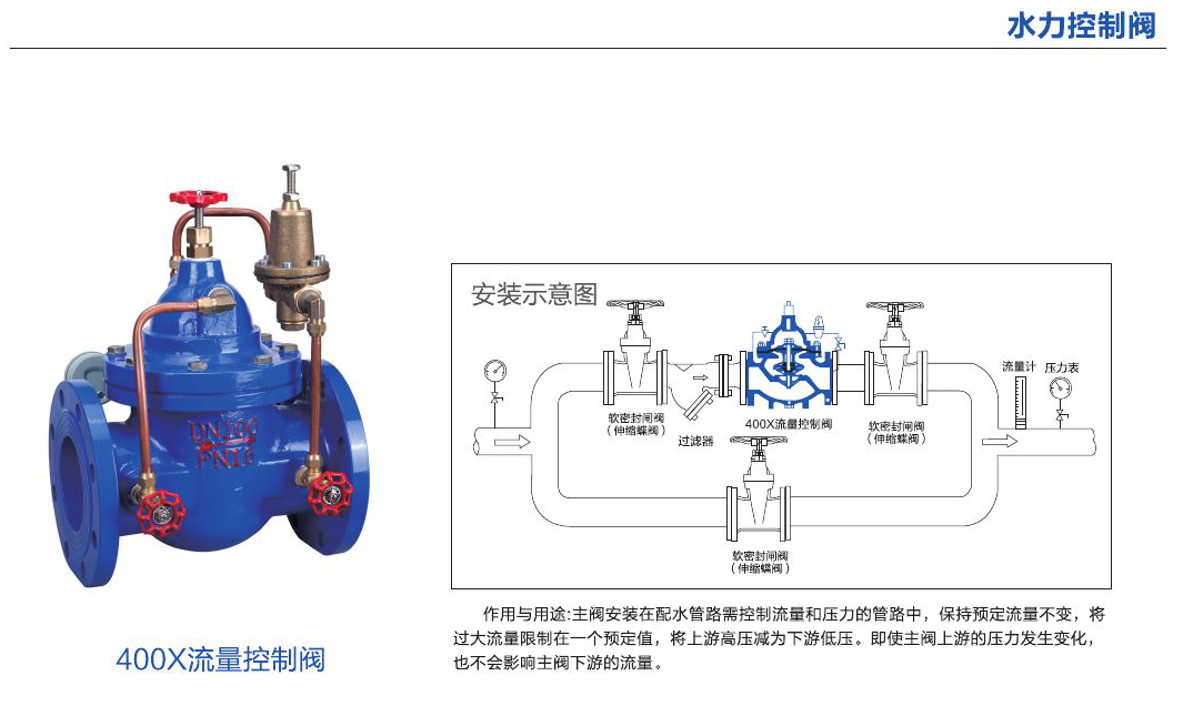 - 主閥安裝在配水管路需控制流量和壓力的管路中,保持預(yù)定流量不變,將過大流量限制在一個(gè)預(yù)定值,將上游高壓減為下游低壓。