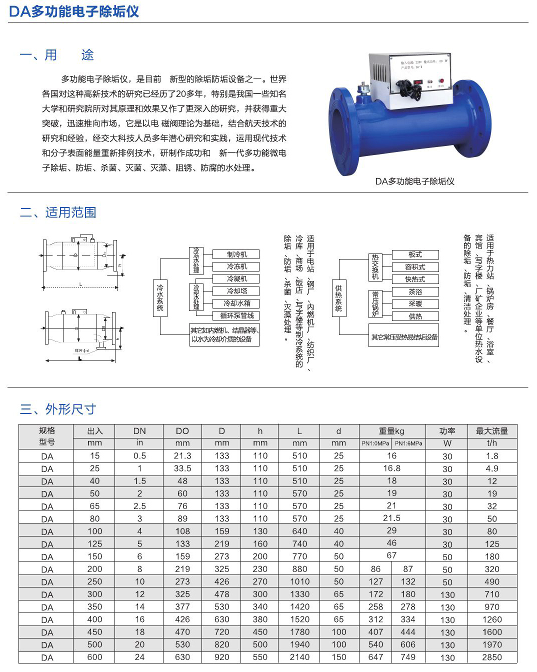 - 多功能電子除垢儀,是目前新型的除垢防垢設(shè)備之一。世界各國對(duì)這種高新技術(shù)的研究已經(jīng)歷了20多年,特別是我國一些知名大學(xué)和研究院所對(duì)其原理和效果又作了更深入的研究,并獲得重大突破,迅速推向市場,它是以電磁閥理念經(jīng)為基礎(chǔ),結(jié)合航天技術(shù)的和經(jīng)驗(yàn),經(jīng)交大科技人員多年潛心研究和實(shí)踐,運(yùn)用現(xiàn)代技術(shù)和分子表面能量重新排例技術(shù),研制作成功和新一代多功能微電子除垢、防垢、殺菌、來菌、來藻、陰銹、防腐的水處理。