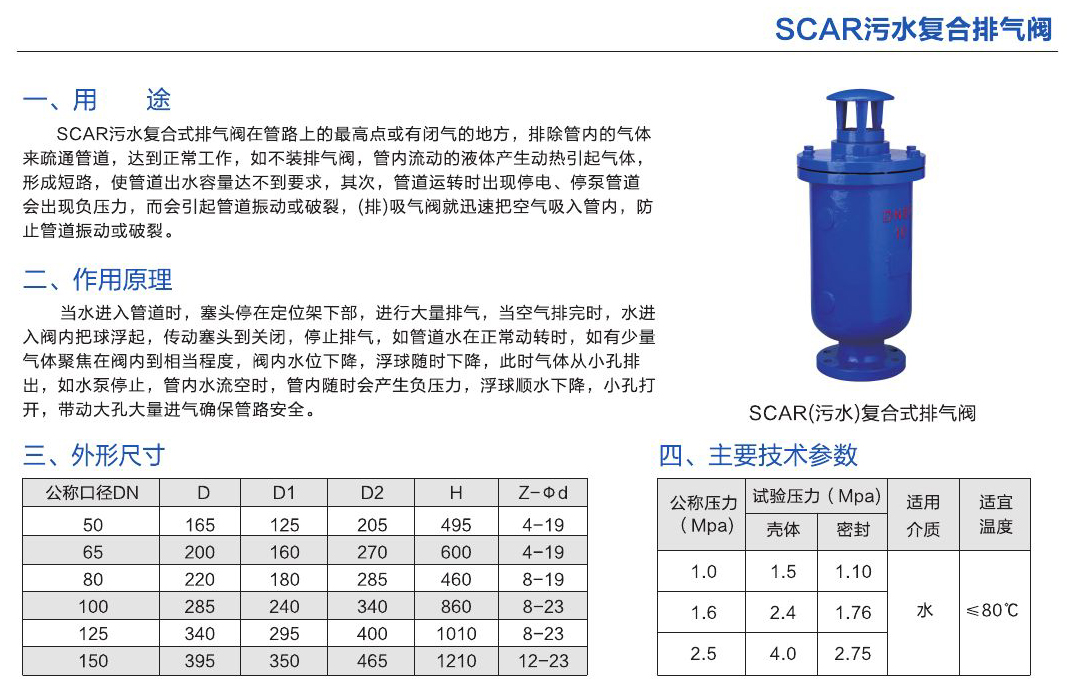 - SCAR污水復(fù)合式排氣閥在管路上的高點(diǎn)或有閉氣的地方,排除管內(nèi)的氣體通管道。