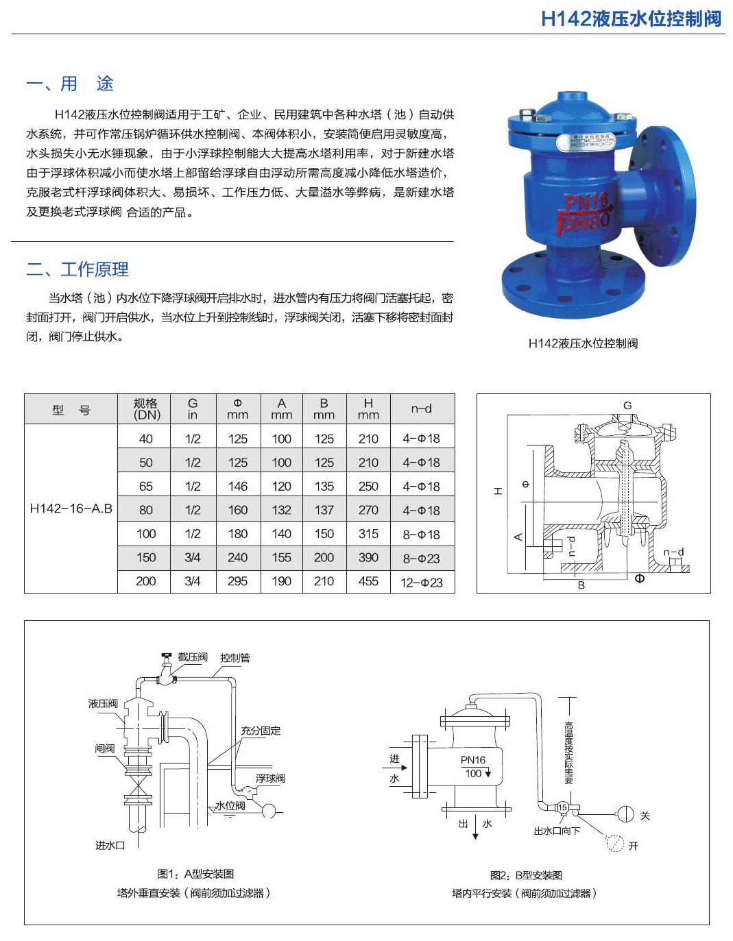 - H142液壓水位控制閥適用于工礦、企業(yè)、民用建筑中各種水塔(池)自動(dòng)供水系統(tǒng),并可作常壓鍋爐循環(huán)供水控制區(qū)閥、體閥體積小,安裝簡(jiǎn)便啟用靈敏度高,水頭損失小無水錘現(xiàn)象。