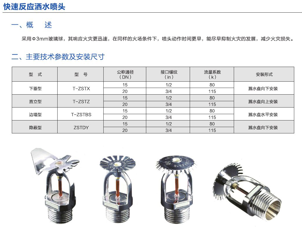 - 采用Ø3MM玻璃球,其響應(yīng)火災(zāi)更迅速,在同樣的火場條件下,噴頭動(dòng)作時(shí)間更早,能盡早抑制火災(zāi)的發(fā)展,減少火災(zāi)損失。