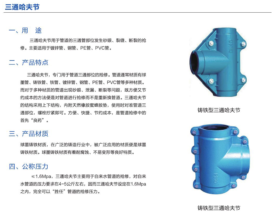 - 三通哈夫節(jié)用于管道的三通管部位發(fā)生砂眼、裂縫、斷裂的搶修。主要適用于鍍鋅管、鋼管、PE管、PVC管。