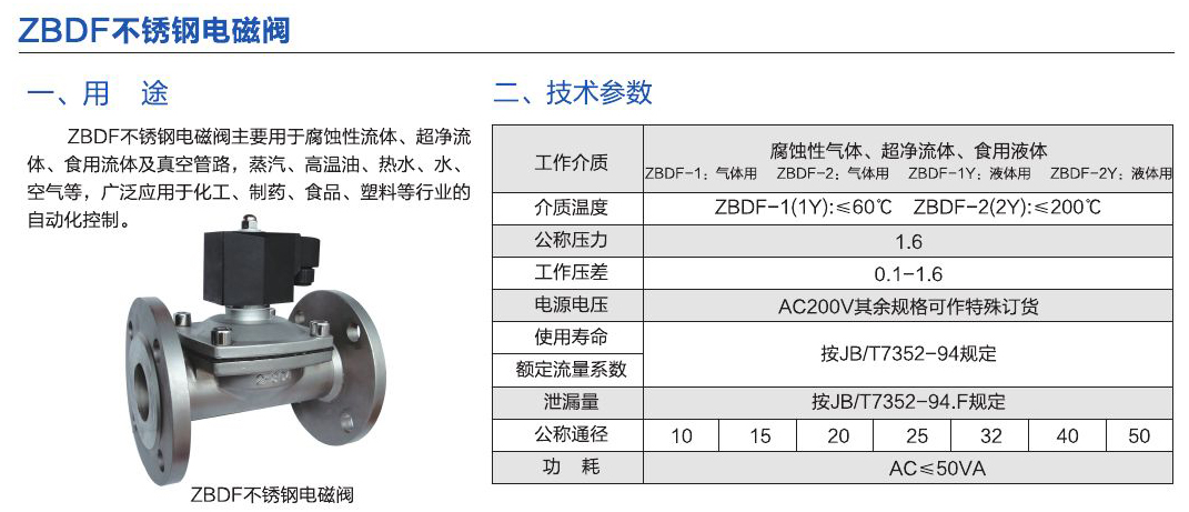 - ZBDF不銹鋼電磁閥主要用于腐蝕性流體、超凈流體、食用流體及真空管路,蒸汽、高溫油、熱水、水、空氣等,廣泛應(yīng)用于化工、制藥、食品、塑料等行業(yè)的自動化控制。