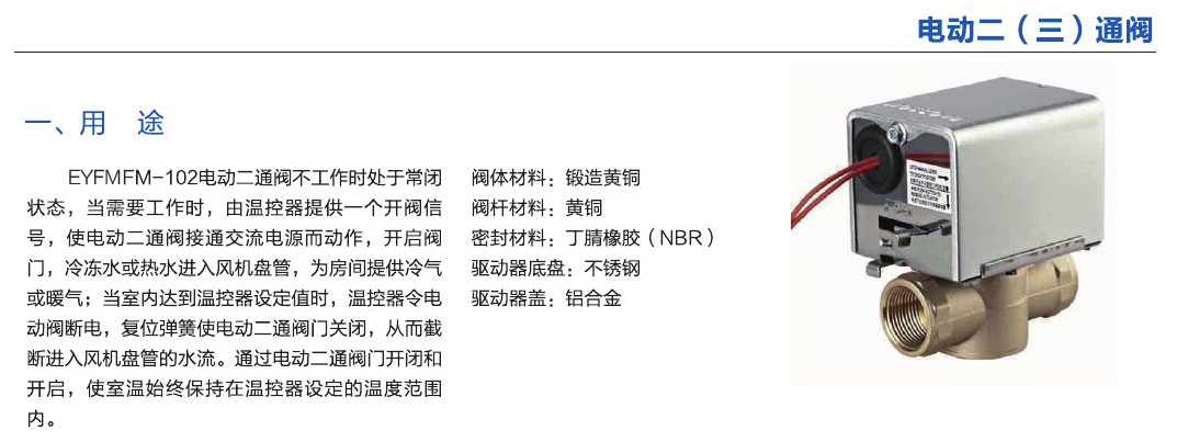- LGDZFM-102電動(dòng)二通閥不工作時(shí)處于常閉狀態(tài),當(dāng)需要工作時(shí),由溫控器提供一個(gè)開(kāi)閥信號(hào),使電動(dòng)二通閥接通交流電源而動(dòng)作,開(kāi)啟閥門,冷凍水或熱水進(jìn)入風(fēng)機(jī)盤(pán)管,為房間提供冷氣或暖氣。