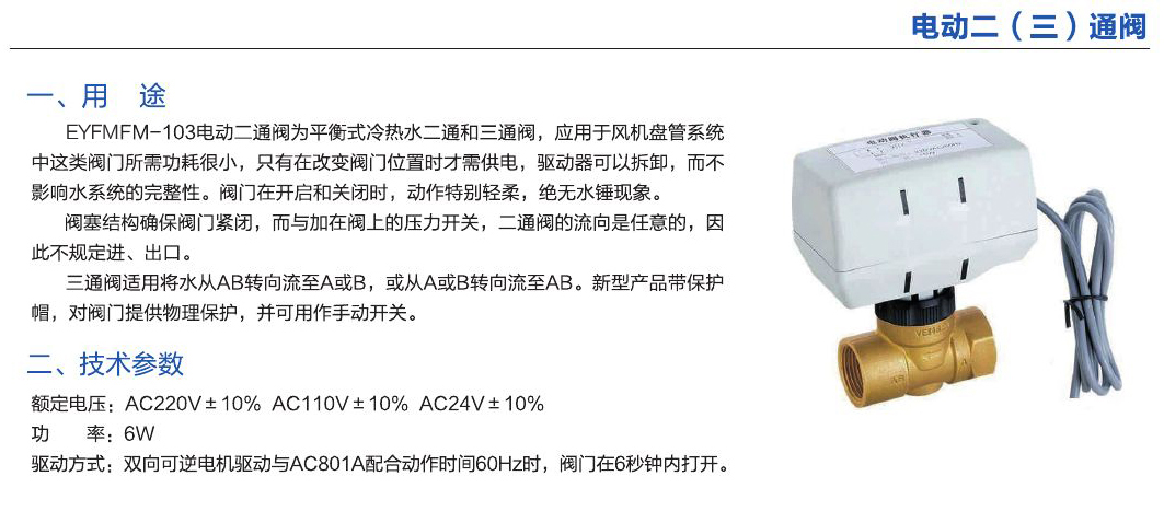 - LGDZFM-103電動二通閥為平衡式冷熱水二通和三通閥,應用于風機盤管系統(tǒng)中這類閥門所需功耗很小,只有在改變閥門位置時才需供電,驅(qū)動器可以拆卸,而不影響水系統(tǒng)的完整性